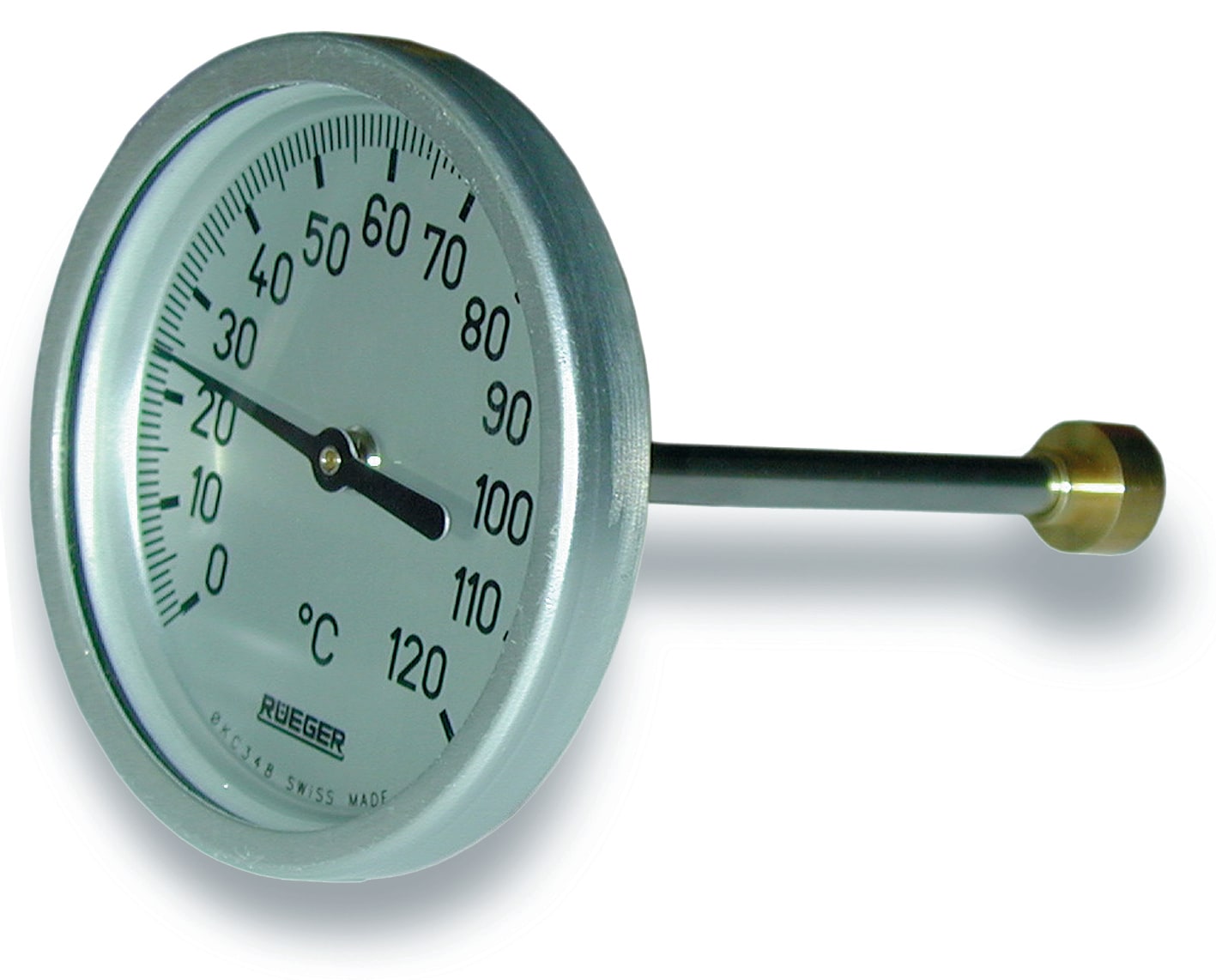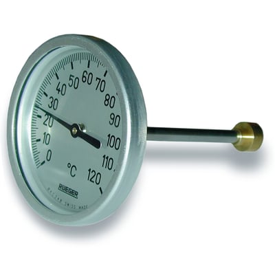 Rüeger termometer type TCH. 0-120° Ø100 med 100 mm føler. Klasse 1 og følerhus i rustfri AISI 304. Termometret skal monteres i en dykrørslomme.