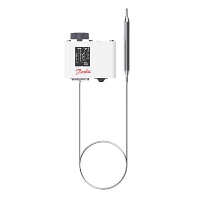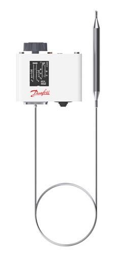 KP termostat med adsorptionsfyldning. Føler kan monteres koldere/varmere end huset. Temperaturdifferencen angives ved laveste/højeste set-temperatur.