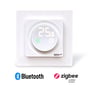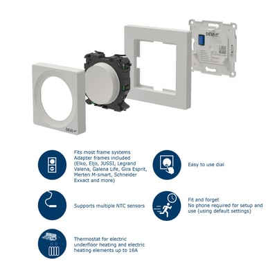 Takket være dens specialdesignede 2-delte konstruktion, passer termostaten til en bred vifte af rammer. Betjeningen er gjort enkel og intuitiv med en drejeknap og et tydeligt display. Opsætningen er hurtig og nem via en guide i Bluetooth-appen.