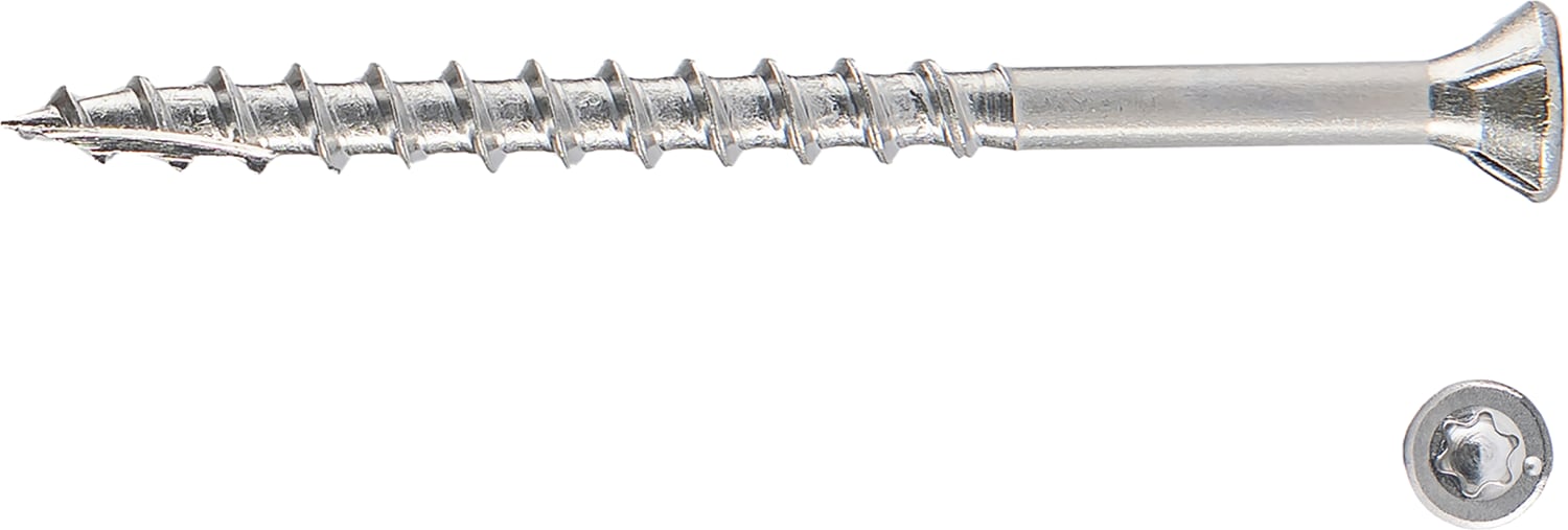 Terrasseskruen er designet til at give et stærkt og holdbart greb i træet, samtidig med at den minimerer risikoen for flækning. Den er velegnet til både hårdt og blødt træ.