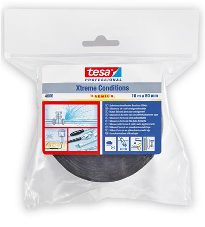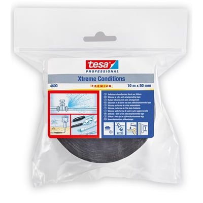 tesa® 4600 er en selvvulkaniserende silikonetape, som hæfter på sig selv. Det smidige materiale lægger sig tæt ind til de forskellige overflader, hvorved der opnås en øjeblikkelig hermetisk forsegling. Den selvvulkaniserende reparationstape kan anvendes både indendørs og udendørs og fungerer også perfekt på olieglatte, snavsede eller våde overflader. Den kan sågar anvendes under vand.