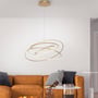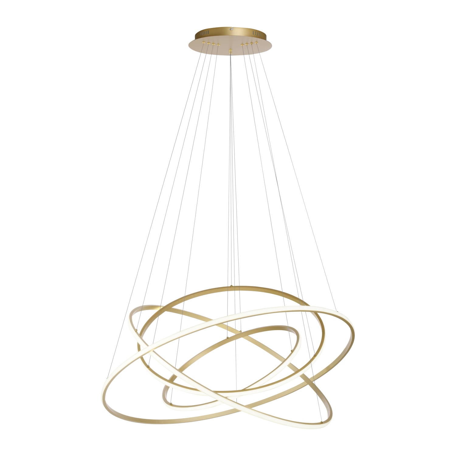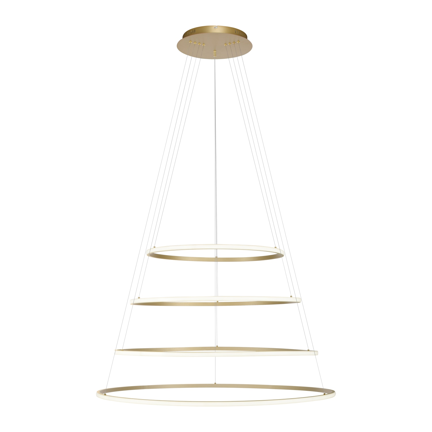 Elegant Tessara LED pendel med fire ringe i messing. Justerbar lysfarve og trinvis dæmpning via almindelig kontakt.
