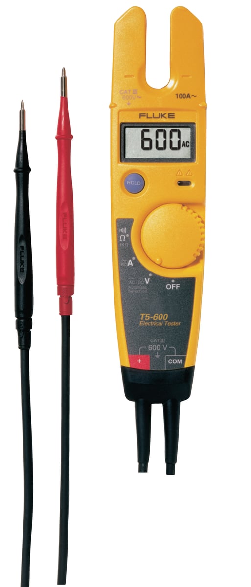 Med den elektriske tester Fluke T5-600 kan du kontrollere spænding, gennemgang og strøm med ét kompakt værktøj. Du skal blot vælge volt, ohm eller strøm, og testeren klarer resten af arbejdet.
