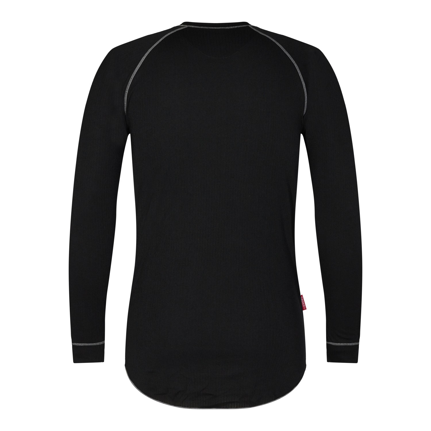 Termoundertrøje med lang ryg, der holder lænden varm. Rib i hals og ved håndled. Materialet transporterer sved væk fra huden for at bevare isoleringsevnen.