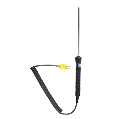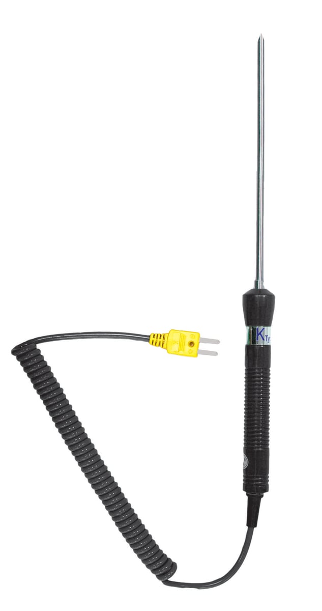 K-type temperaturføler til indstikning i bløde og højviskose materialer. Med en følerlængde på 165 mm og varmebestandigt håndtag. Nøjagtighedsklasse 2. Kun til ThermoMaster. Måleområde: -50°C til 800°C.