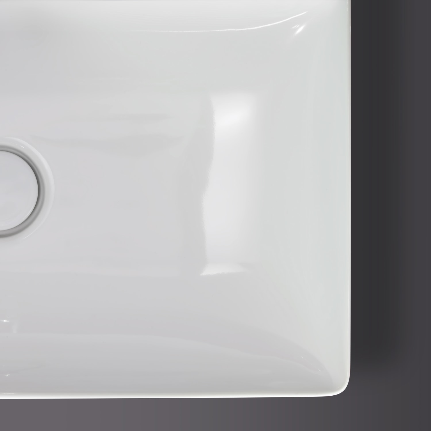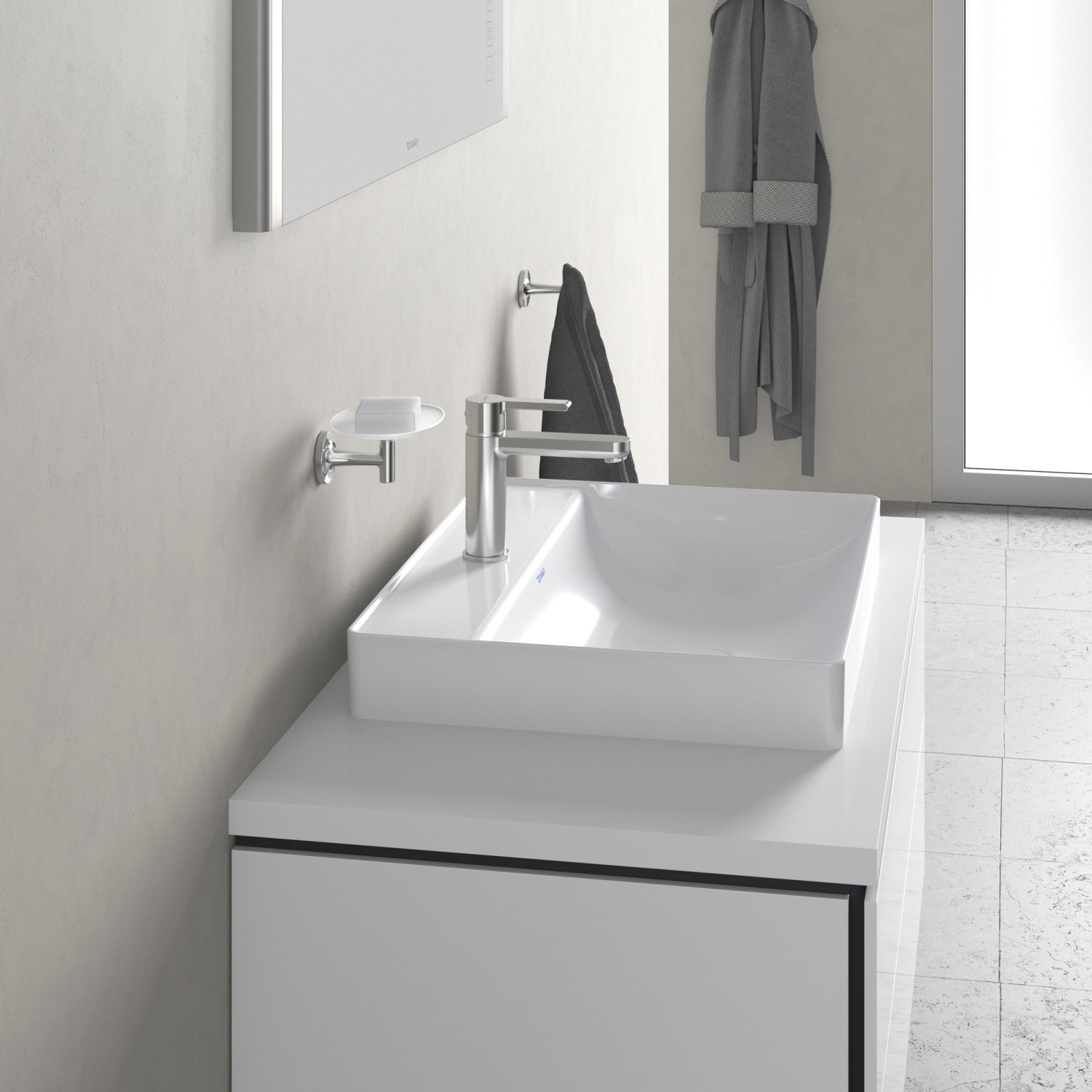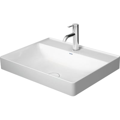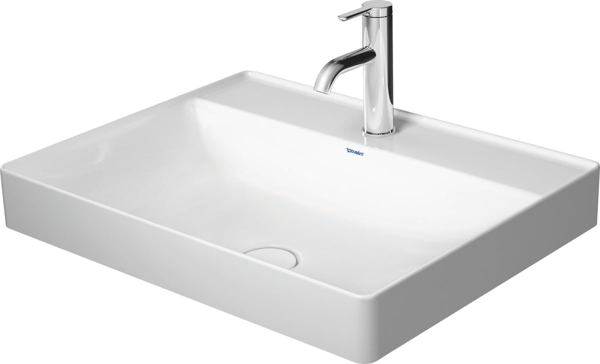 Duravit DuraSquare bowle i hvid højglans. Inkl. keramisk bundventil, uden overløb, med hanehul, slebet underside og glaseret bagkant. Mål: 600 x 470 mm.