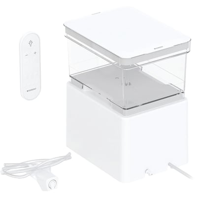 Geberit AquaClean Cama tilslutningsenhed til toilet med brugsvandsopvarmning via gennemstrømsvandvarmer og transparent vandtank med 3 liters indhold.