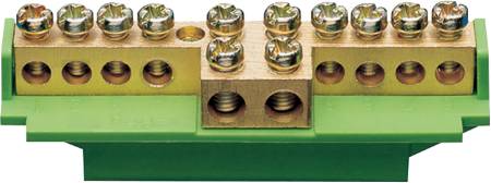 Tilslutningsklemme 69 mm med sokkel, jord. 10 klemmer: 2x16 + 8x10 mm².