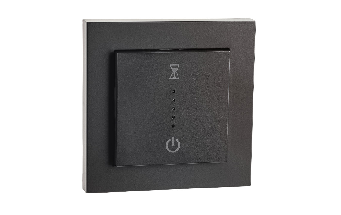 Timer 13A til belysning, kaffemaskiner, ventilatorer m.m. Justerbar efterløbstid: 5 min. - 8 timer. Resterende tid vises via indikatorlamper. Kan kombineres med ekstern trykknap.