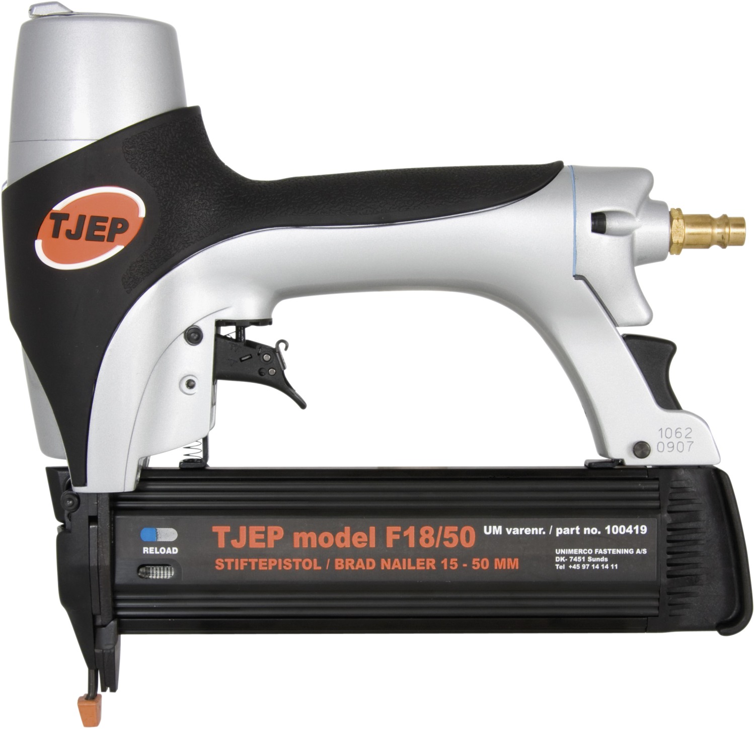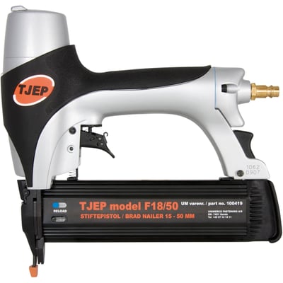 Stiftepistol til sømning af sand- og fejelister, paneler, rammer og møbler. Med justerbar udblæsning, justerbar slagdybde og indikation for tomt magasin.
