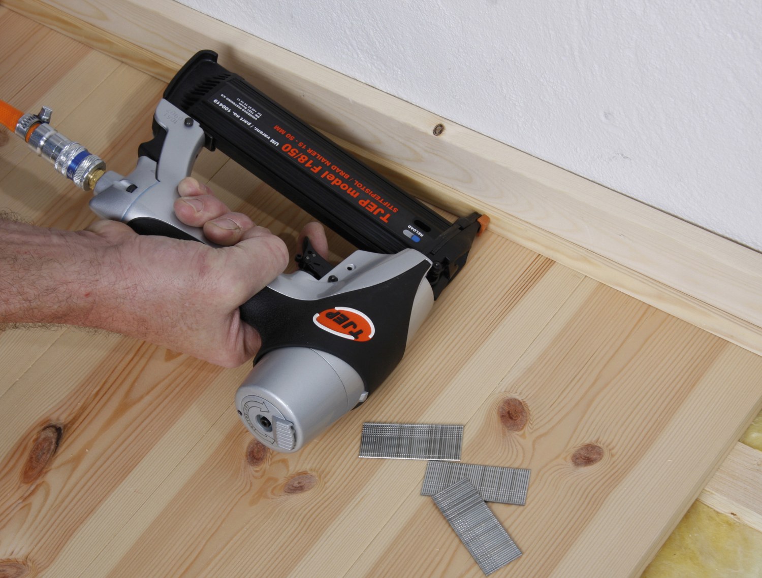 Stiftepistol til sømning af sand- og fejelister, paneler, rammer, møbler mv.