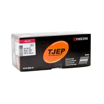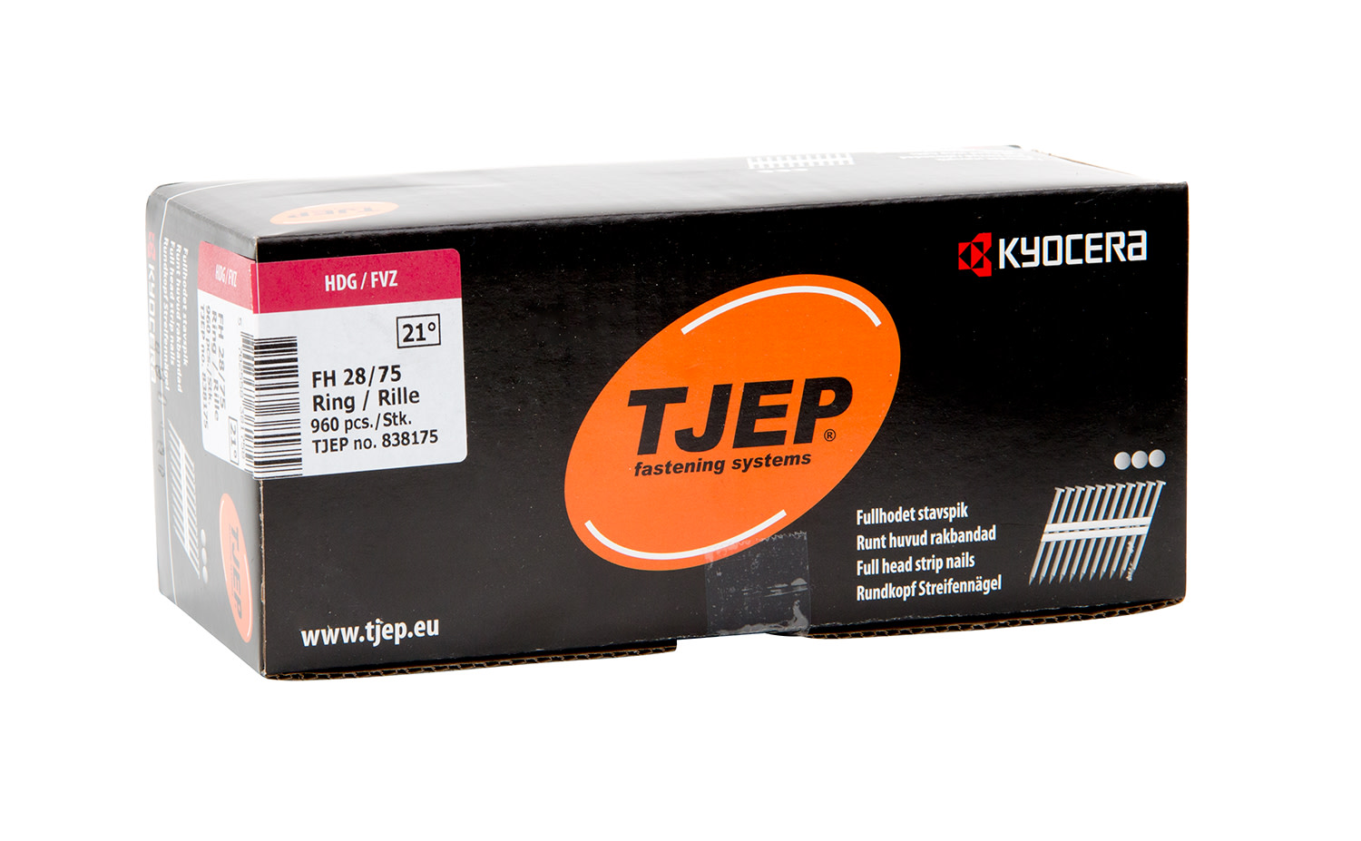 Denne æske indeholder 960 stk. TJEP FH28/75 ringsøm, der er varmgalvaniserede og vinklet i 21°.