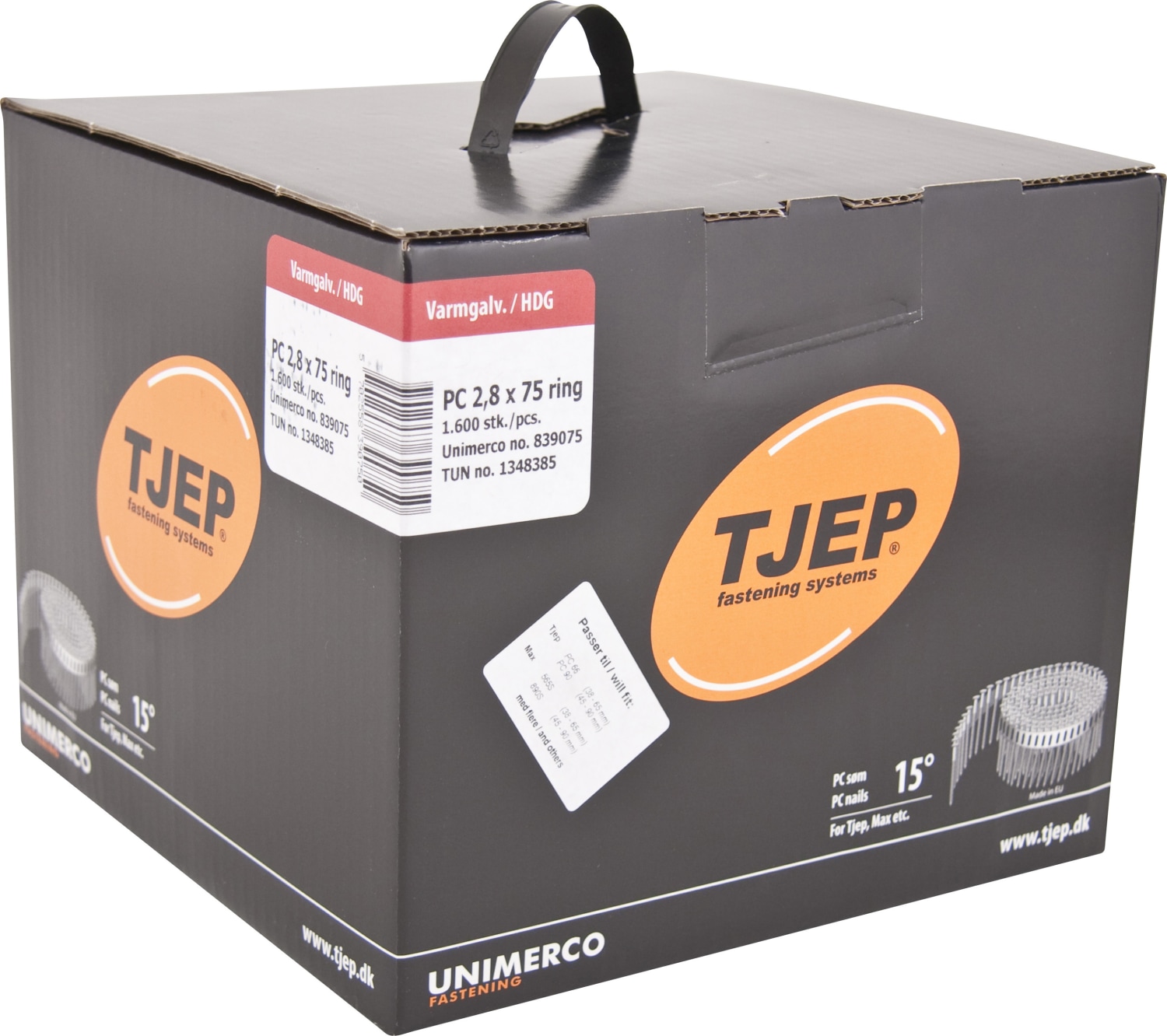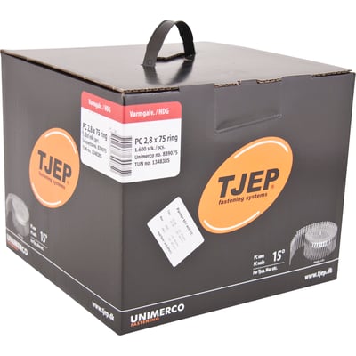 CE-godkendt ifølge EN 14592 / EUROCODE 5. Varmgalvaniseret ringsøm med en diameter på 2,8 mm og en længde på 75 mm.