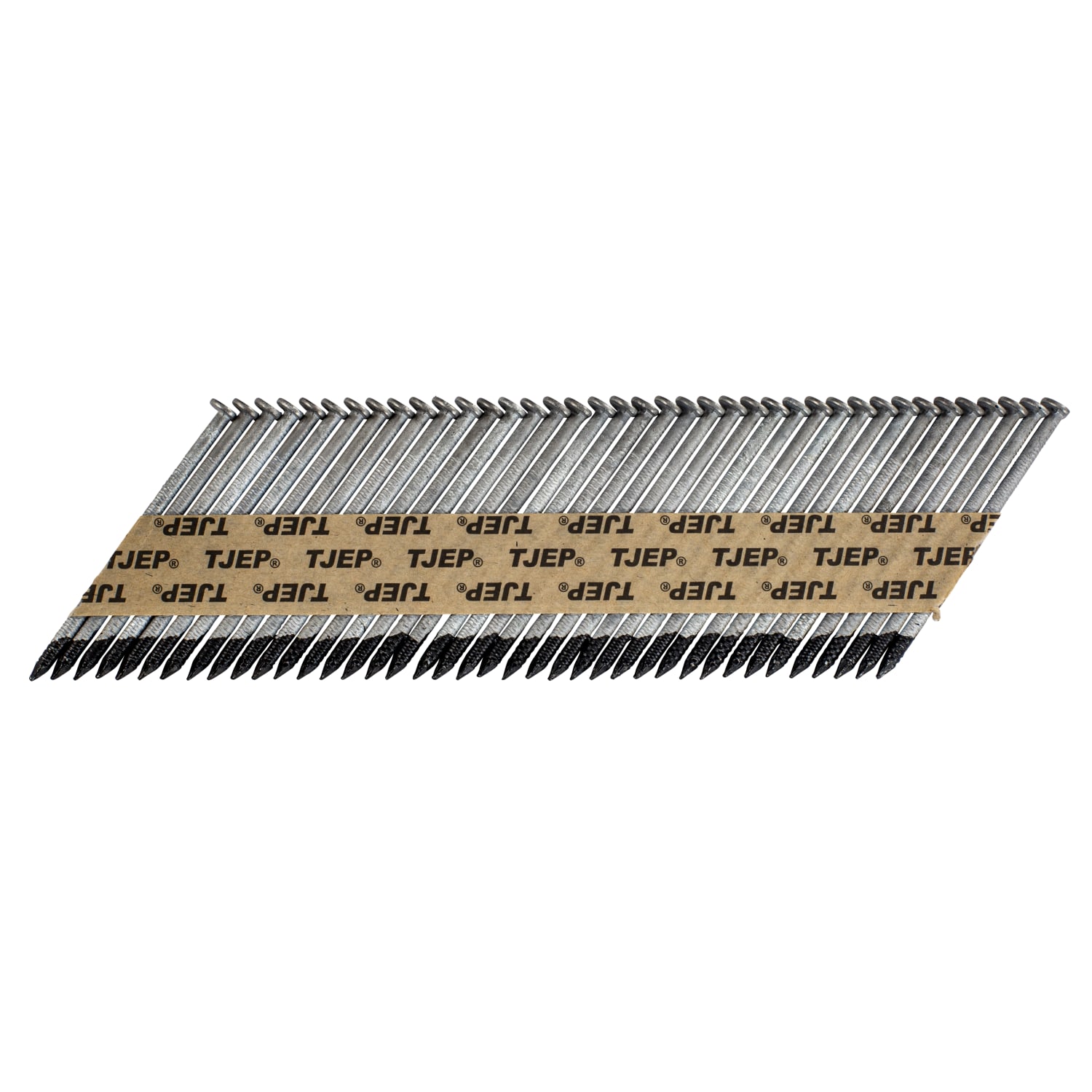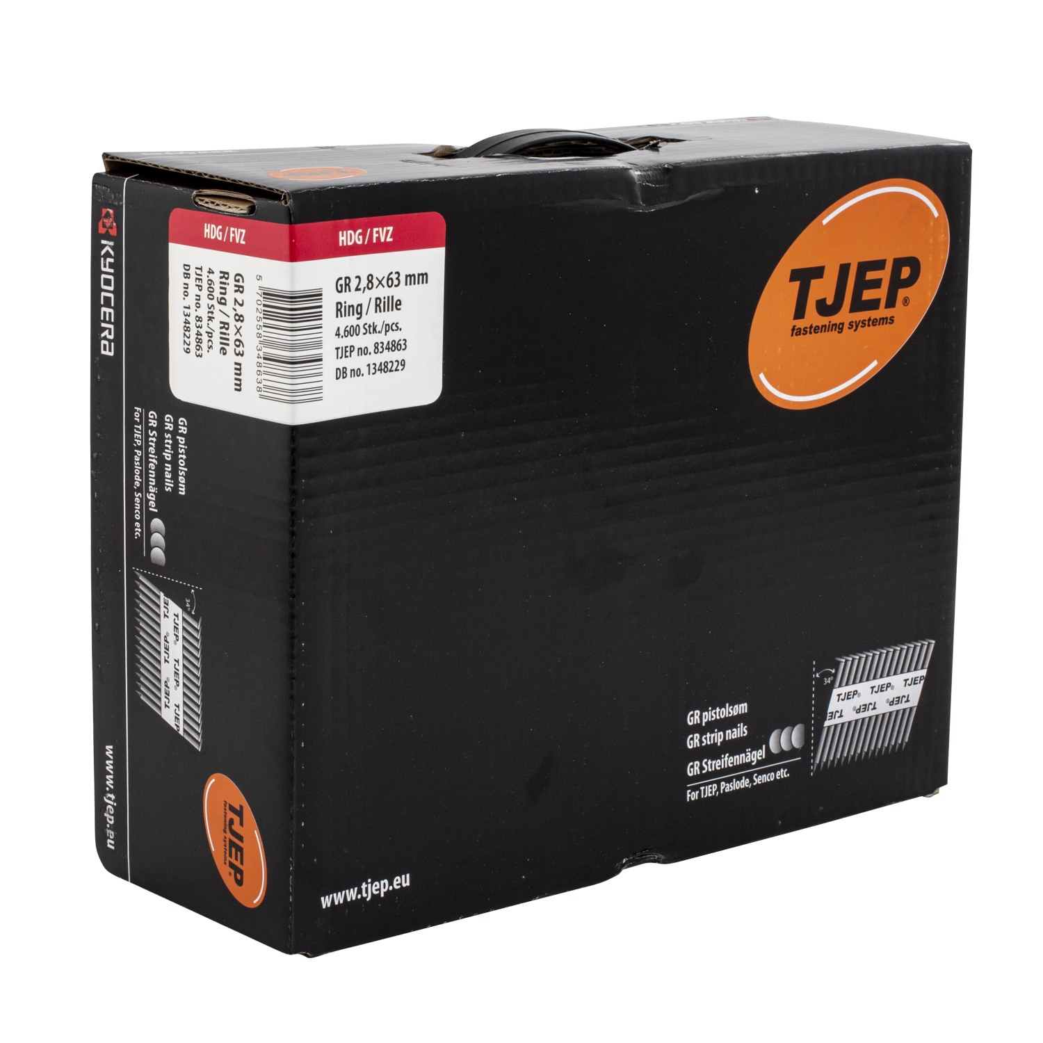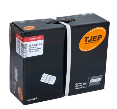 34° skråtstillet ringsøm med D-hoved. Varmgalvaniseret overflade. Diameter 2,8 mm, længde 63 mm. Leveres i JUMBOBOX med 4.600 stk.