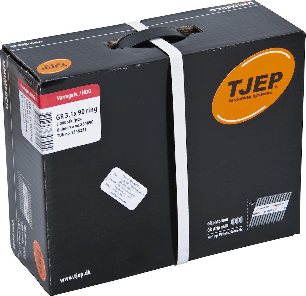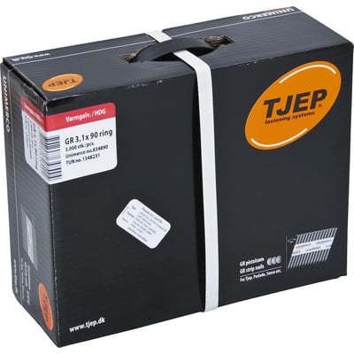 Varmgalvaniseret ringsøm med D-hoved og 34° vinkel. Leveres i JUMBOBOX med 3.000 stk.