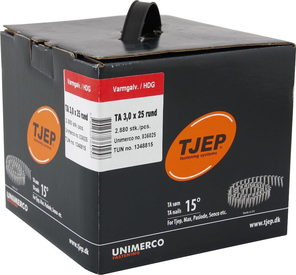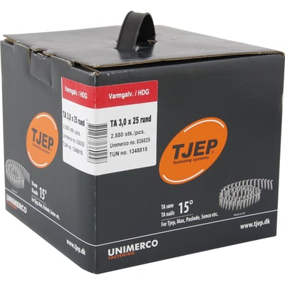 Varmgalvaniserede tagpapsøm med en diameter på 3,0 mm og en længde på 25 mm. Leveres i en kasse med 2880 stk. og passer til flere populære tagpapsømpistoler.