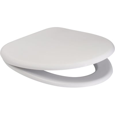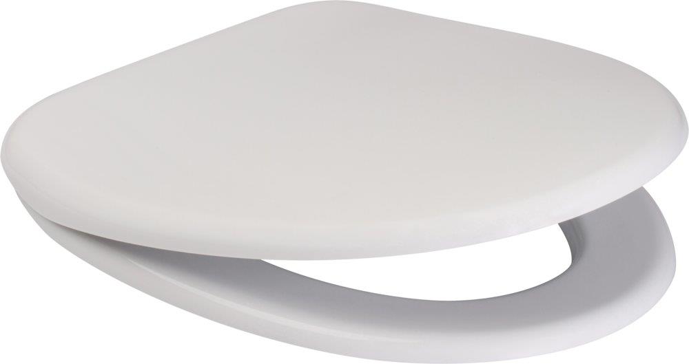 Hvidt toiletsæde i hård plast, designet til Scandi toiletter med fast beslag og en afstand på 155 mm mellem sædeboltehullerne.