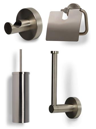 Komplet toiletsæt i børstet nikkel. Inkluderer toiletrulleholder, toiletbørste, håndklædekrog og reservepapirholder.