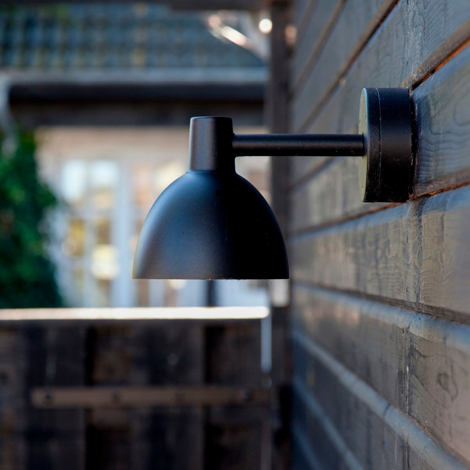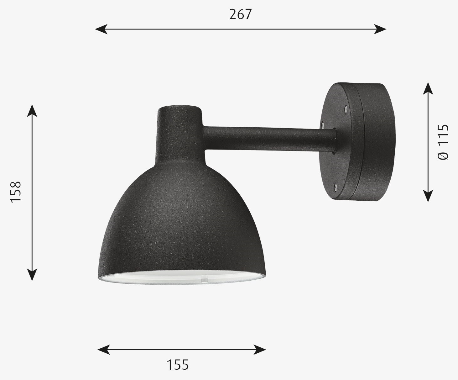 Toldbod væglampe 155 er designet til at give et optimalt, nedadrettet lys. Med sin mathvide lakerede inderside sikrer armaturet et blødt, diffuseret og behageligt lys, der er ideelt til udendørs belysning. Denne væglampe er fremstillet i robust aluminium og har en IP-klasse på 44, hvilket gør den velegnet til udendørs brug.