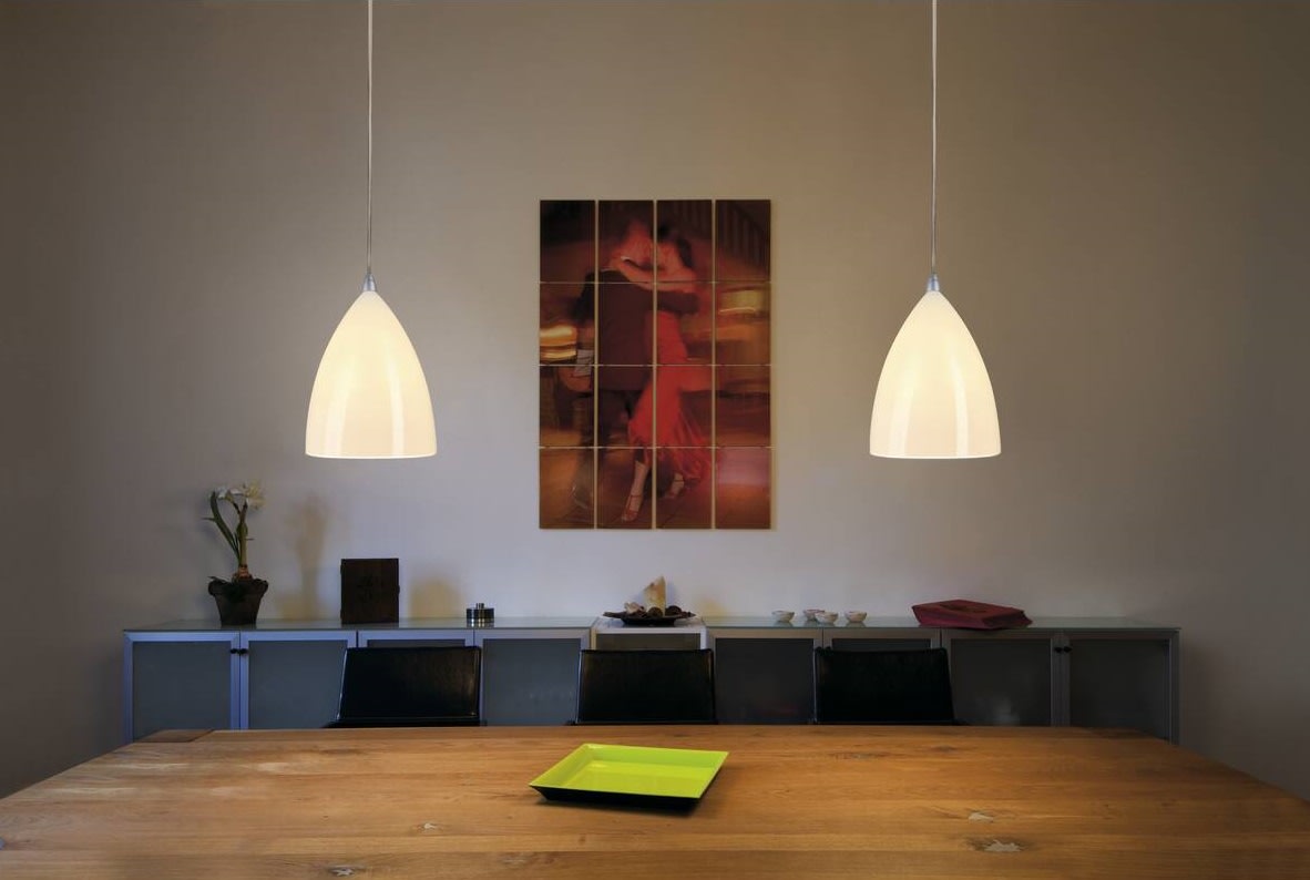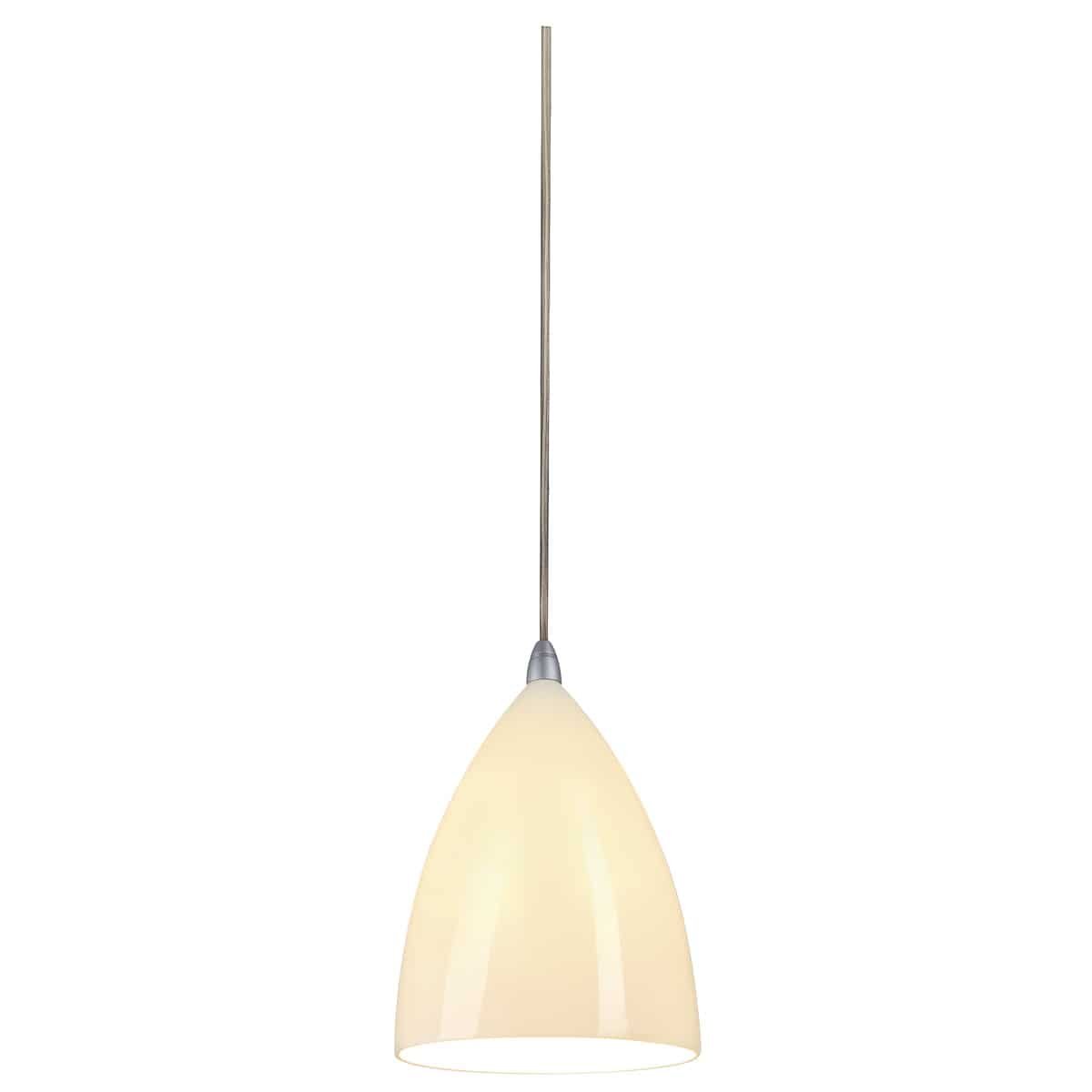 Stilfuld TONGA pendel med hvid, rund keramisk skærm og sølvgrå loftplade. Max 60W.