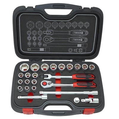 Tecos T2024 topnøglesæt med 24 dele. Indeholder 18 toppe (10-32 mm), forlængere, 3-vejs adapter, T-greb, kardanled, fleksibelt ledhåndtag og 1/2" skralde med 72 tænder. Leveres i kasse.