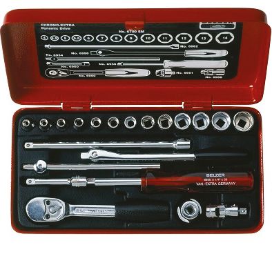 Bahco topnøglesæt med 21 dele. Sættet indeholder højtlegeret stål med højglanspolering og leveres i en ovnlakeret stålkasse med kunststofindlæg.