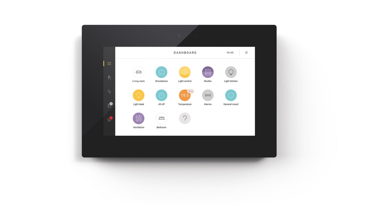 Denne touchskærm giver dig mulighed for bekvemt at betjene hele Niko Home Control installationen fra et centralt sted. Du kan tænde, slukke og dæmpe belysningen, styre temperaturen, markiser, rullegardiner og persienner til den ønskede position, samt overvåge energiforbruget og installationens status. Takket være en indbygget lyssensor tilpasser skærmens lysstyrke sig automatisk til det omgivende lys.