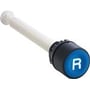 Harmony Style 5 trykknap med kunststof frontring, Ø22 mm. Komplet enhed med paddetryk, sort Ø40mm. Blå trykknap med 'R' (reset) mærkning.