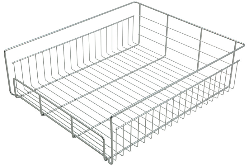 Trådkurv i silver mat stål til skab. Passer til M60 skabsbredde. Bredde inkl. afstandsstykker: 567 mm. Inkl. skruer, distanceskiver og udtræksskinne. Velegnet til skydedøre og hængslede låger.