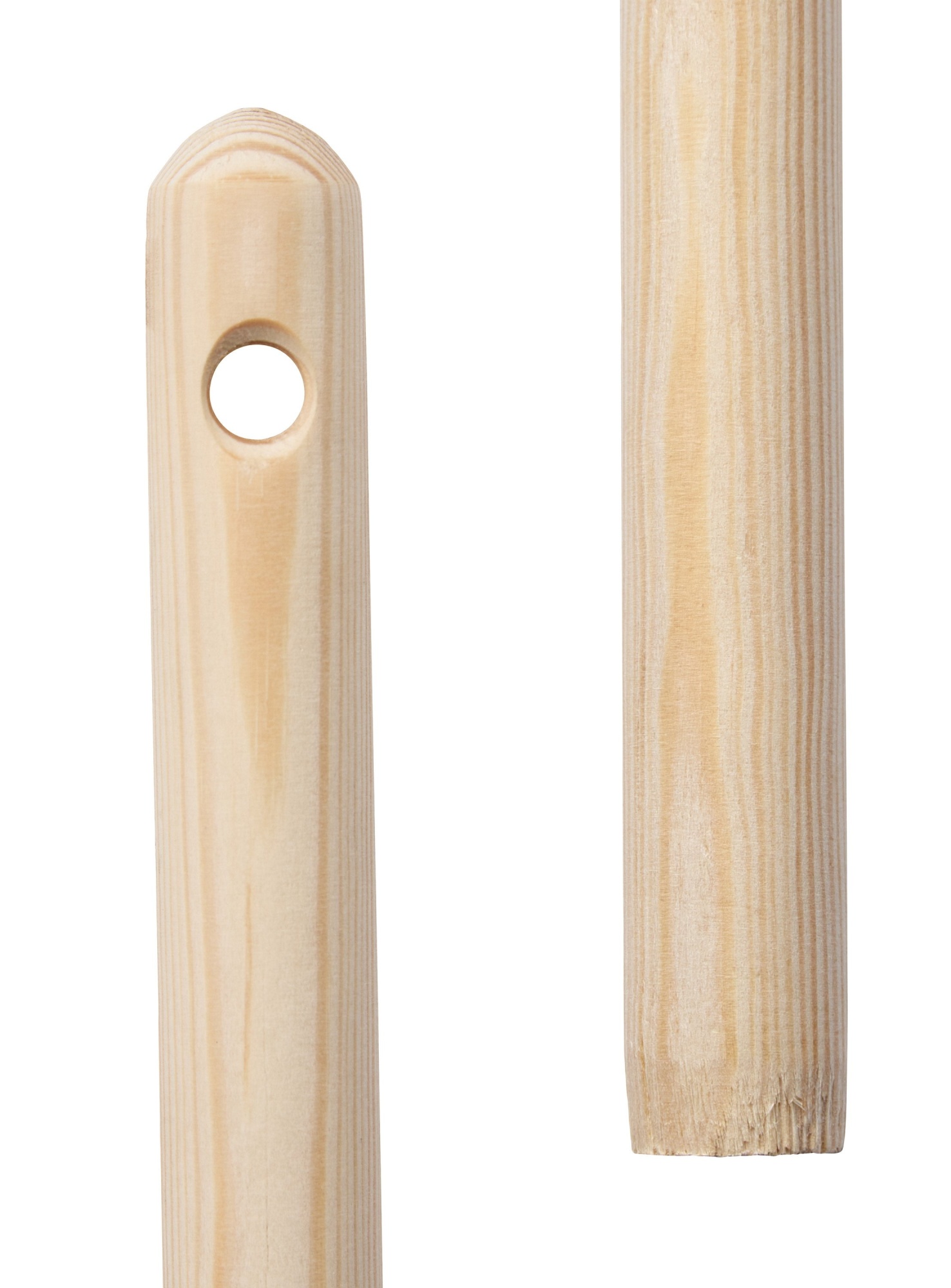Træskaft i europæisk ulakeret fyrretræ. Konisk spidset i den ene ende og rundet i den anden. Længde 130 cm. Med hul til ophæng.