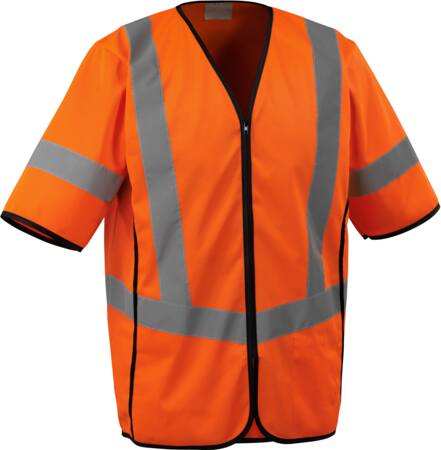 Fluorescerende trafikvest med lodrette og vandrette reflekser, gennemgående lynlås, inderlomme og kantet med bånd. Stor i størrelsen.