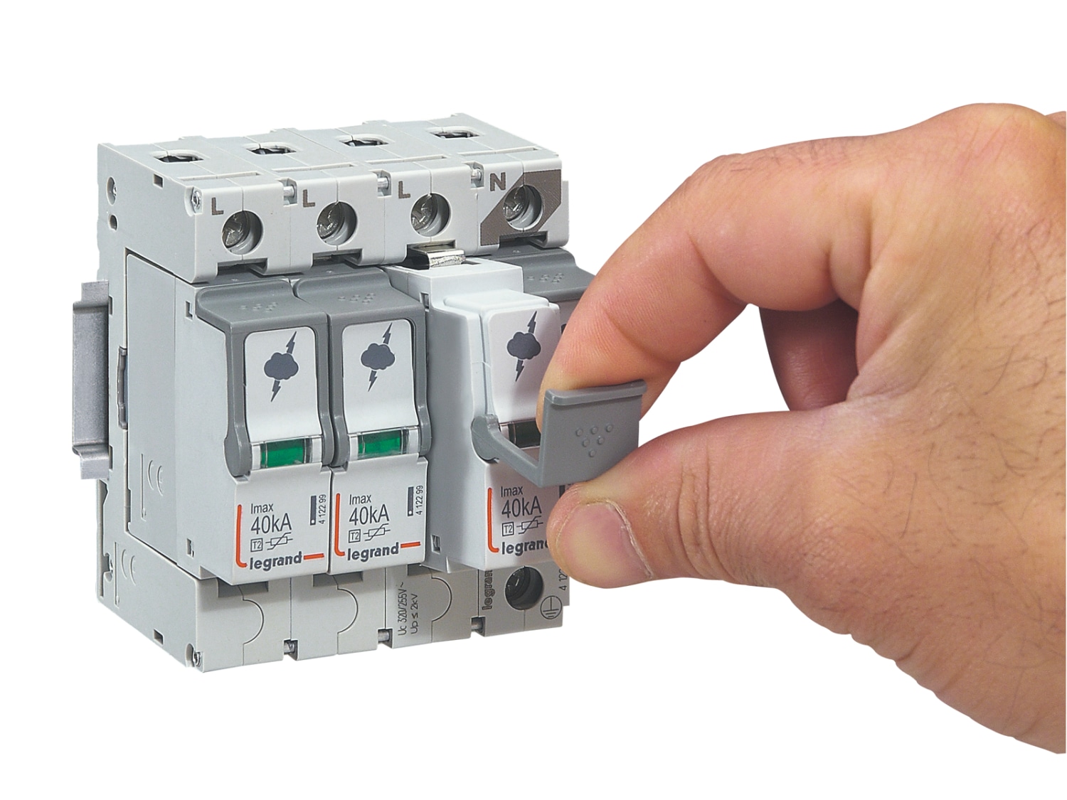 Legrand 412247 type 2 transientbeskyttelse til TT og TNS systemer. Med plug-in moduler og statusindikatorer. Anbefales til større installationer.