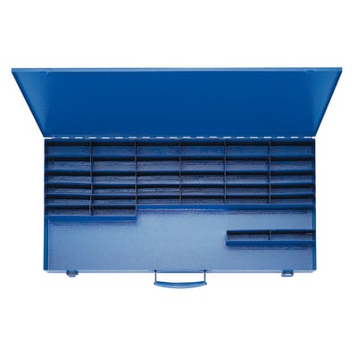 Sortimentskasse i metal til opbevaring af K18 værktøj og bakker. Hammerslaglakeret med 34 små og 1 stort rum.