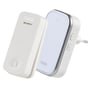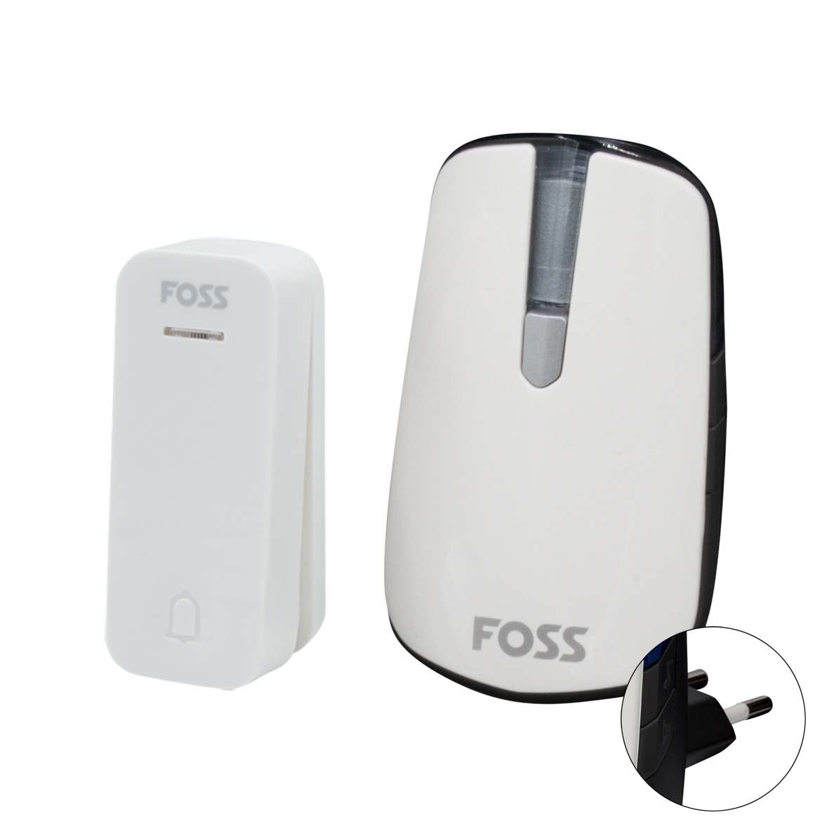 Trend dørklokke Bluu 1 Novus i hvid. Plug-in model med vandtæt dørklokke (IP44), kinetisk og uden batteri. Har 32 melodier, lydstyrkeregulering, blinkende LED og rækkevidde op til 150 meter.