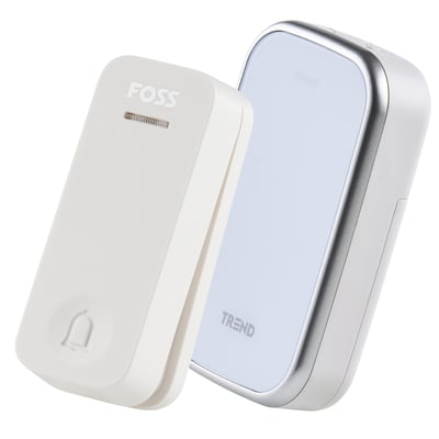 Trådløs dørklokke fra Trend med 32 melodier og 150 meters rækkevidde. Vandtæt dørtryk (IP 44) og blinkende LED.