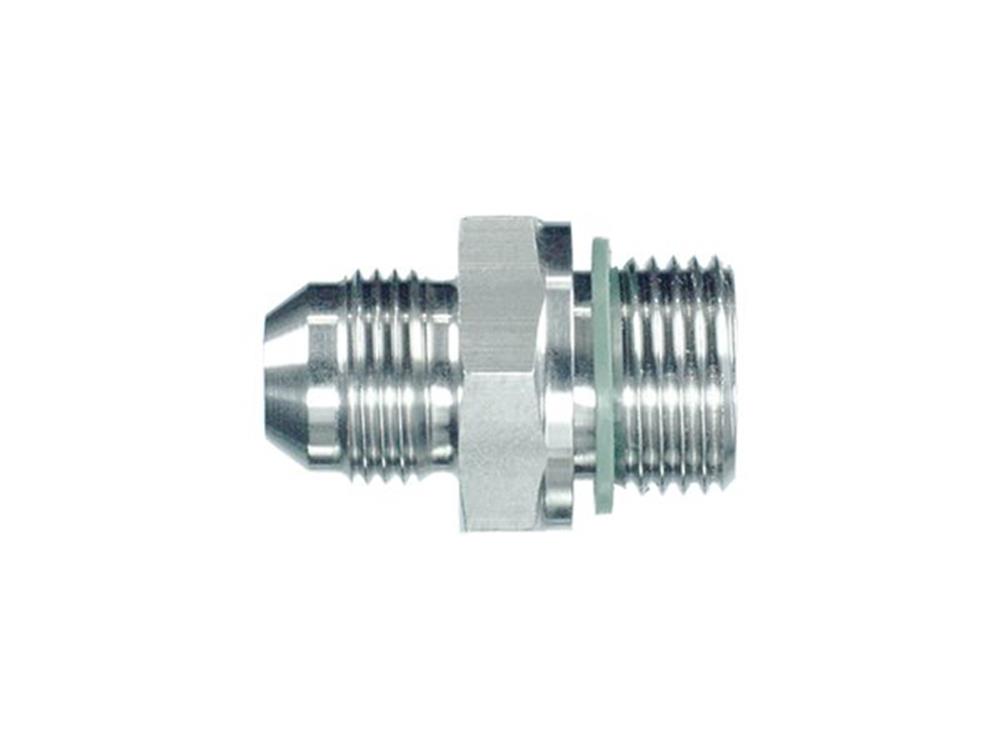 Syrefast indskruning med udvendig BSP gevind og viton o-ring i den ene ende og udvendig JIC gevind i den anden ende. Anvendes til udkravning af hydraulikrør med 37 graders konus.