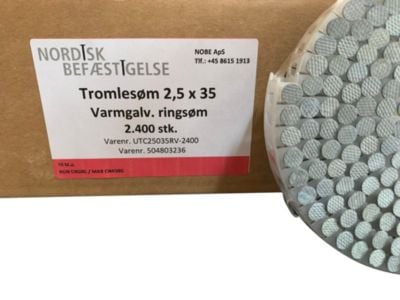 Tromlesøm til sømpistol med en diameter på 2,5 mm og en længde på 35 mm. Varmgalvaniseret ringsøm. 2.400 stk. pr. pakke. Passer i RGN CN50G, MAX CN450G, TJEP m.fl.