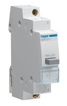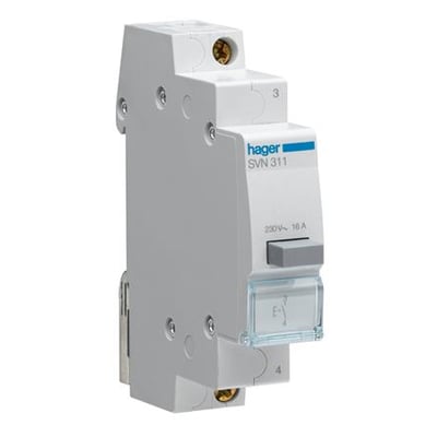 Hager trykknap til betjening af styrefunktioner direkte fra eltavlen. 1 modul á 17.5 mm. Mærkestrøm: 16A AC12. Mærkespænding: 250VAC.
