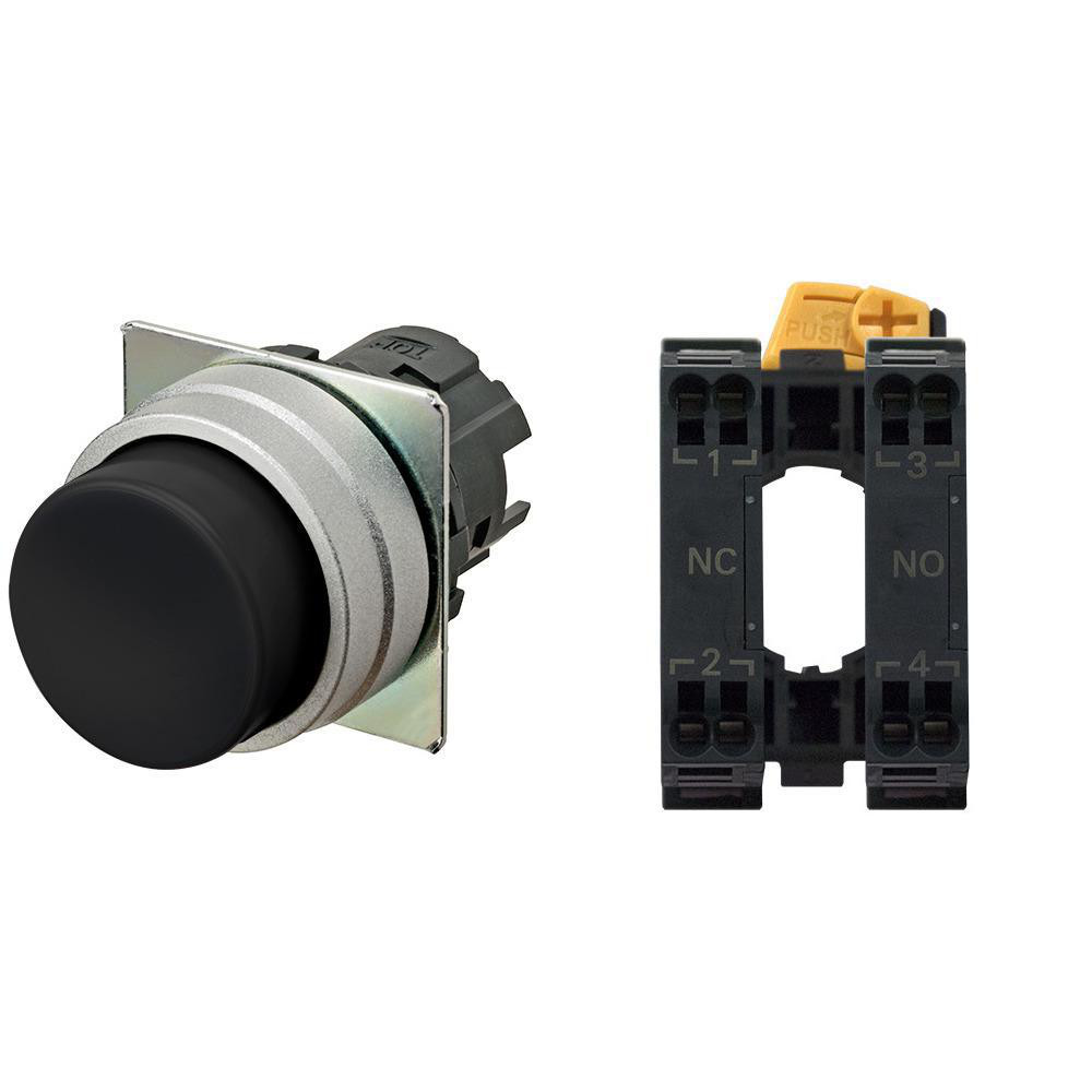 A22NN Ø22 trykknap med børstet metal bezel, PROJICERET, MOMENTARY, Opaque BLACK cap, 1NO1NC, og push-in terminal.