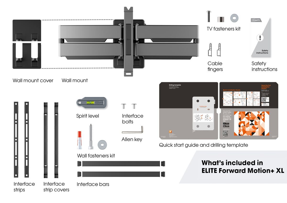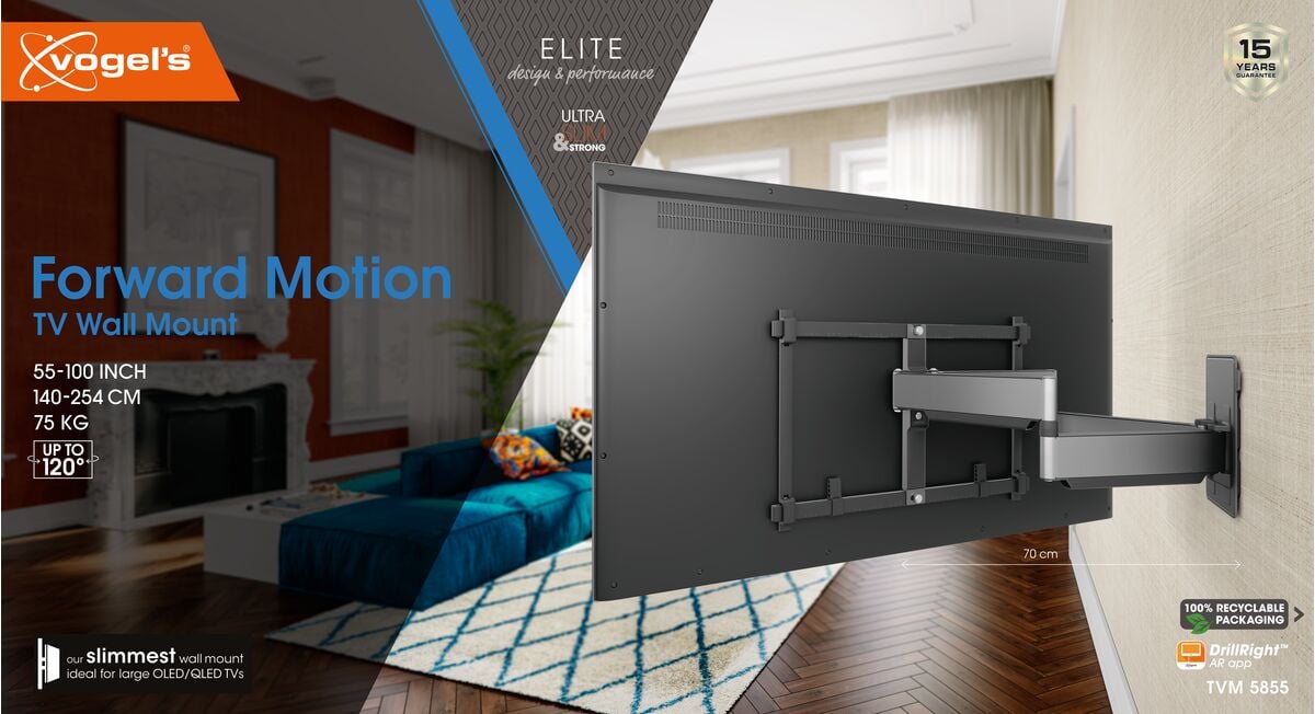 Full-motion TV-vægbeslag til store, tunge TV op til 100" og 75 kg. ELITE Forward Motion er et ekstra stærkt vægbeslag, der er egnet til TV fra 55 til 100 tommer.