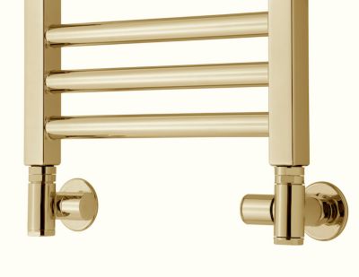 Manuelt vinkel kombi ventilsæt til vandbårne håndklædetørrer. Bruges til kombination af fjern-/centralvarme og el. Guld (PVD) overflade. Inkl. rørafdækninger.