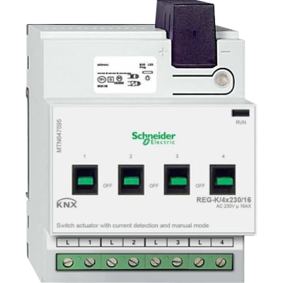 Relæudgang med strømdetektering og manuel styring. Kan koble fire belastninger via separate slutte kontakter. Manuel betjening mulig uden busspænding.