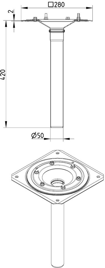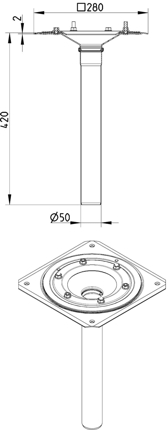 Underdel til tagafløb med tagfolie-flange på 280x280mm og lodret udløb på ø50mm. Fremstillet i syrefast rustfrit stål AISI304/EN1.4301.
