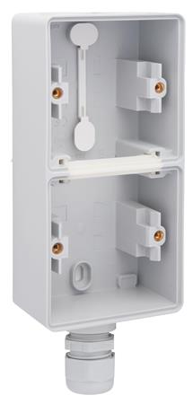 Stænktæt 2-modul underlag fra Hydro med M20 indgang og kabelforskruning. Opnår IP55 kapslingsklasse. Robust og farveægte. Fås i grå, hvid og sort.