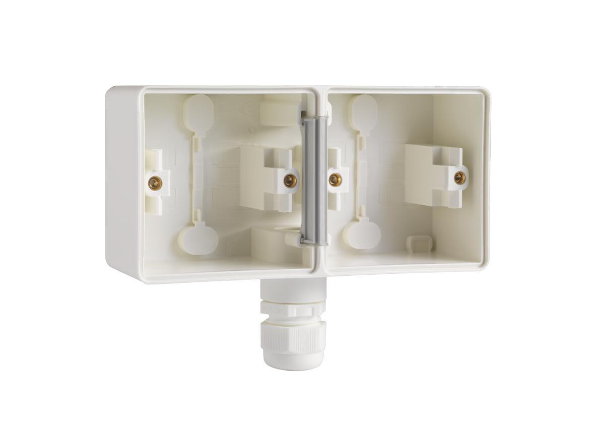 Hydro stænktæt underlag 2-modul vandret med én M20-indgang, inklusiv kabelforskruning. Opnår kapslingsklasse IP55. Slagfast og gennemfarvet design i hvid.