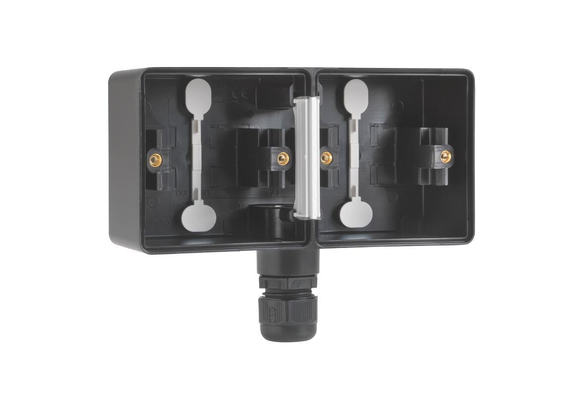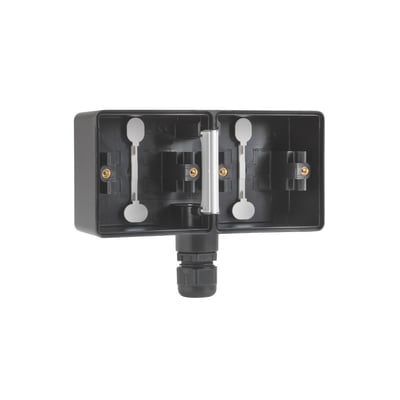 Hydro stænktæt underlag til 2-modul vandret installation. Inkluderer én M20-indgang med kabelforskruning og opnår IP55-kapslingsklasse. Slagfast og gennemfarvet i sort.