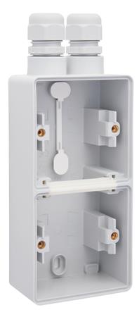 Stænktæt 2-modul underlag med to M20-indgange og kabelforskruninger. Opnår kapslingsklasse IP55. Slagfast og gennemfarvet. Fås i grå, hvid eller sort.