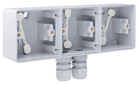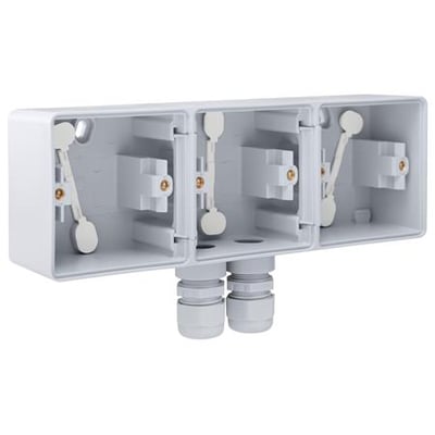 Hydro stænktæt underlag til 3-modul med to M20-indgange og kabelforskruninger. Opnår IP55-kapslingsklasse, er slagfast og gennemfarvet. Fås i grå, hvid eller sort.