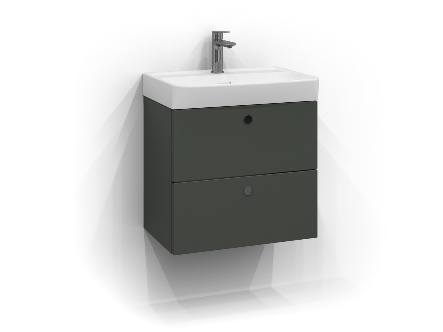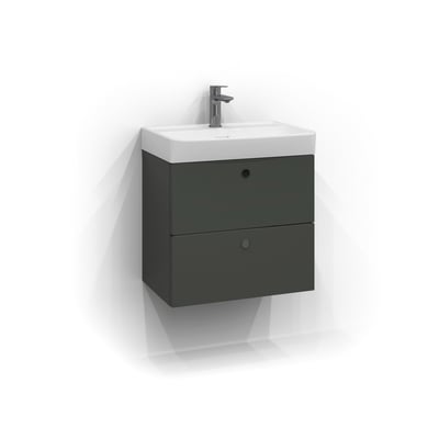 Underskabet er udført i en smuk salviegrøn mat finish, der tilføjer et sofistikeret touch til dit badeværelse. De to skuffer er udstyret med soft close-funktion, der sikrer en lydløs og blid lukning, samt integrerede greb, der bidrager til det rene og minimalistiske udtryk.