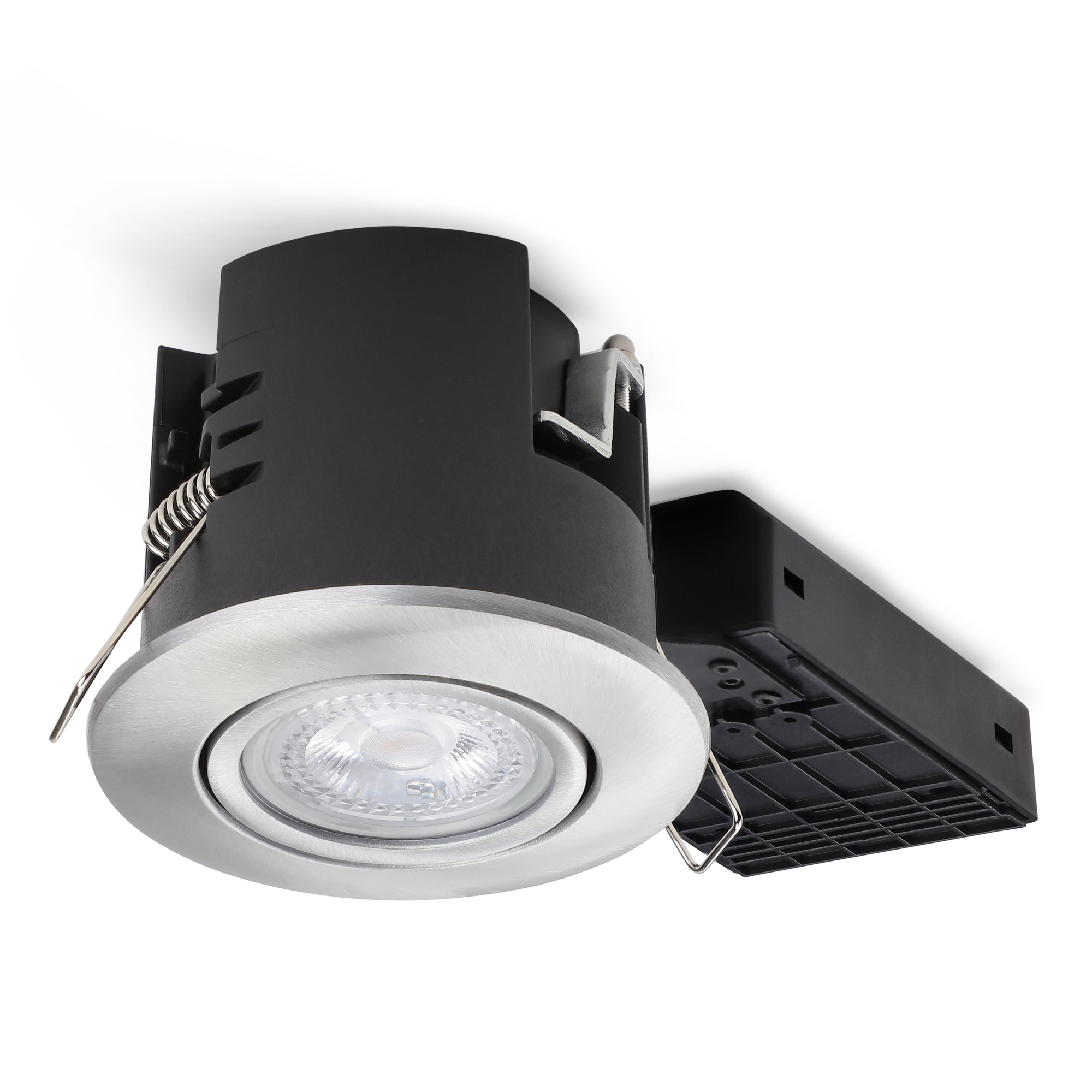 Uni Install indbygningsspot, inkl. LED-pære (Nordtronic Long Life / CRI>90 FlickerFree / 5W / 360lm / 38° / 3000K / dæmpbar<1%), GU10 (230V), rund, børstet alu – NordtronicRestsalg: 400+ stk- Varenr.:9909001402